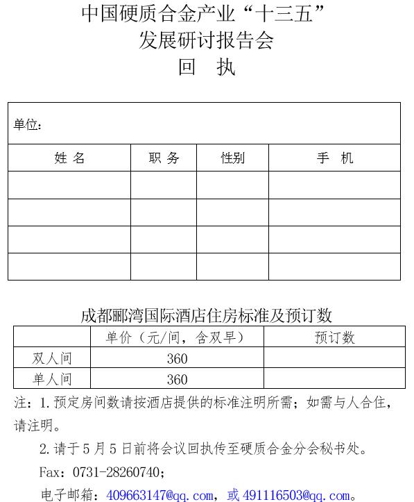 4、會議聯(lián)系人:①中國鎢業(yè)協(xié)會硬質(zhì)合金分會,聯(lián)系電話:0731-28260740聯(lián)系人:羅茵,13975330815②四川科力特硬質(zhì)合金股份有限公司聯(lián)系人:曹軍,13981730208③成都酈灣國際酒店聯(lián)系人:毛麗,13438001400/18030810230酒店總臺電話:028-65101088