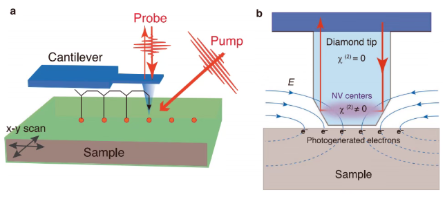 圖1|電光納米顯微技術的概念示意圖。a采用金剛石NV*的超快泵探測測量示意圖,采用“針尖模式”——即在樣品上每個指定點垂直進退原子力顯微鏡探針。樣品通過壓電掃描器在x-y方向掃描。b采用鉆石NV*進行電光采樣的示意圖。