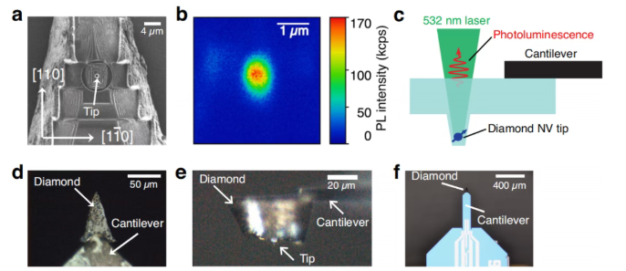 圖2|金剛石NV探針的制備過程。a聚焦離子束制備的金剛石NV*的掃描離子顯微鏡圖像。b金剛石NV*的光致發(fā)光圖像。c用于確認金剛石*NV中心的發(fā)光測量示意圖。在135μW功率的532nm連續(xù)波激光照射后,通過共聚焦顯微鏡將光致發(fā)光信號收集至雪崩光電二極管。d附著于懸臂梁的金剛石NV探針頂視光學圖像。e附著于懸臂梁的金剛石NV探針側視圖。f搭載金剛石NV探針的自傳感懸臂梁光學圖像。