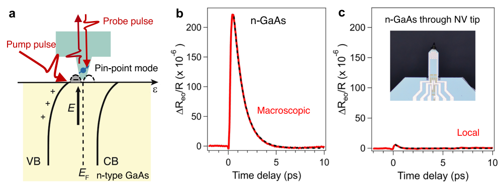 圖3|采用金剛石NV探針在n型砷化鎵基底上檢測電場。a表面能帶彎曲示意圖及金剛石NV*的針尖模式布局。表面態(tài)由鐘形虛線表示,其中費米能級(EF)下方能帶被電子占據(–)。VB和CB分別表示價帶和導帶。b室溫下未放置金剛石NV探針的n-GaAs晶片宏觀時間分辨c采用鉆石NV探針在n-GaAs基片上獲得的局部時間分辨電光信號。插圖展示自傳感懸臂梁的光學圖像,其上附有鉆石NV探針。圖b和c中的黑色虛線曲線為指數(shù)擬合曲線,用于提取正文中闡述的弛豫時間常數(shù)。