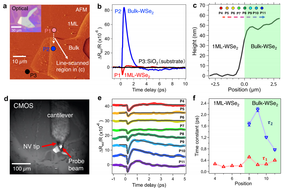 圖4|WSe2上EO信號的時空測量。a采用金剛石NV探針獲得的60μm×60μm區(qū)域地形圖。P1~P3標記宏觀測量位置:P1對應1層WSe2,P2對應體相WSe2,P3對應SiO2襯底。虛線箭頭代表(c)和(e)中的線掃描區(qū)域。b在室溫下,從WSe2/SiO2表面三個不同位置(無金剛石NV探針)獲得的時分辨電光信號。c采用硅探針進行200納米步進的原子力顯微鏡線掃描。P4~P11代表測量位置,從單層到多層(體相)WSe2。高度波動可能源于樣品表面褶皺和/或潔凈室系統(tǒng)的振動。d鉆石NV探針與樣品的CMOS圖像。e鉆石NV探針獲得的局部時間分辨電光信號。e圖中黑色實線分別采用單指數(shù)衰減函數(shù)(單層)與雙指數(shù)衰減函數(shù)(體相)擬合所得。f圖為不同位置時間分辨電光信號擬合獲得的時間常數(shù),誤差條表示標準偏差。c圖與f圖中綠色矩形陰影區(qū)域代表體相區(qū)域。
