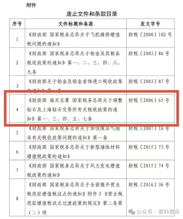 該政策文件當(dāng)年旨在扶持上海鉆石交易所(SDE),助力中國成為亞洲鉆石貿(mào)易的集散中心。其核心內(nèi)容為毛坯鉆石進(jìn)口免征增值稅,成品鉆石進(jìn)口增值稅超過4%的部分即征即退,使得鉆石行業(yè)進(jìn)口環(huán)節(jié)長期享受“低稅負(fù)特區(qū)待遇”,毛坯稅率0%,成匪奧�4%,遠(yuǎn)低于全國統(tǒng)一的13%。