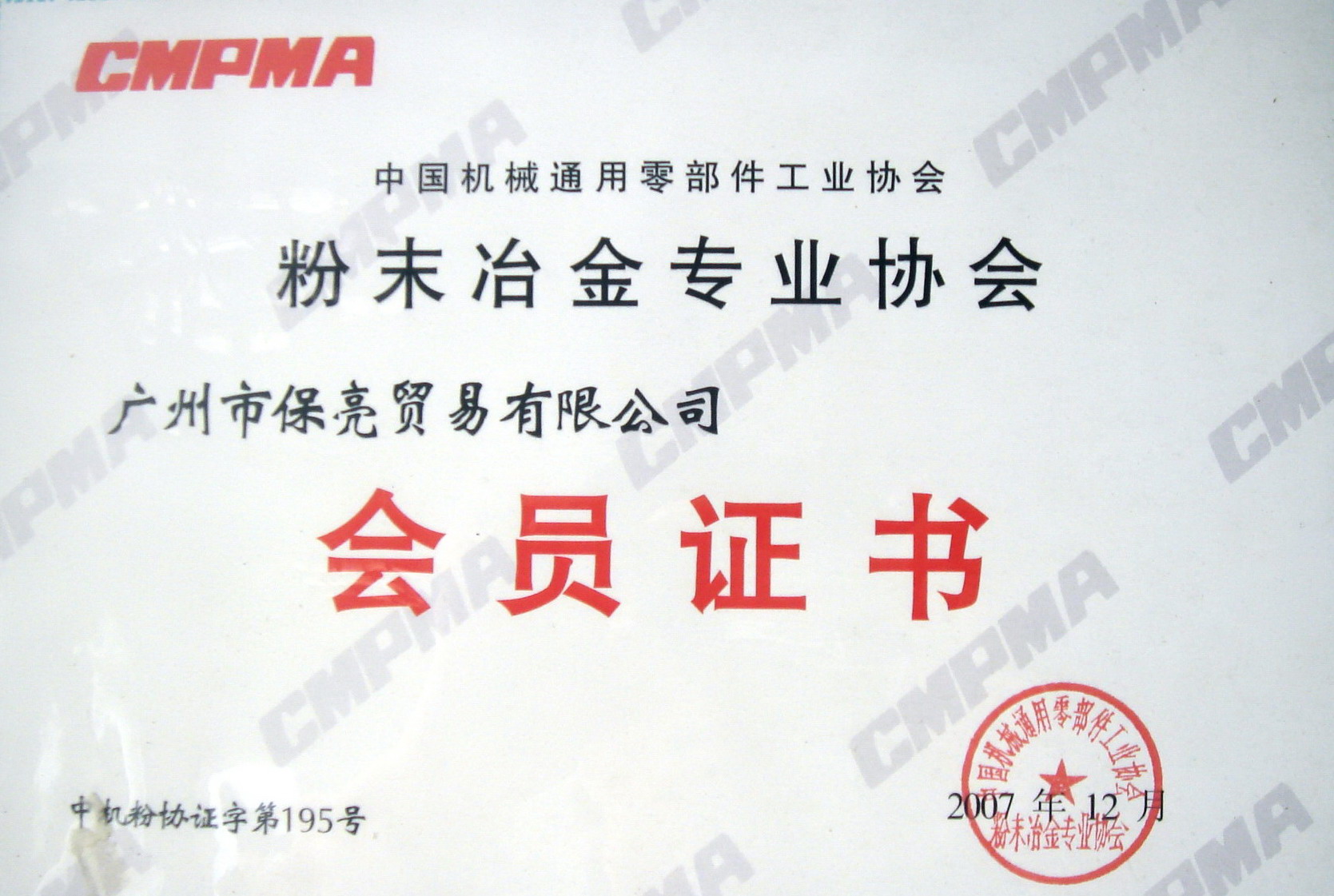 粉末冶金專業(yè)協(xié)會(huì)會(huì)員證書